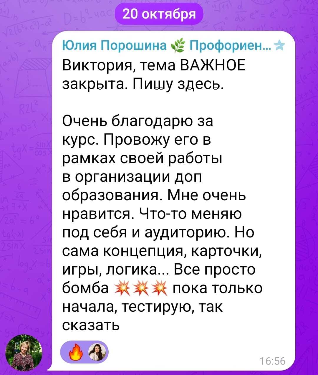 Я прошла много обучений по ведению консультаций, программ, групп в профориентации и получила много опыта внедрения этих знаний, прежде чем начинать делиться своими продуктами с коллегами.