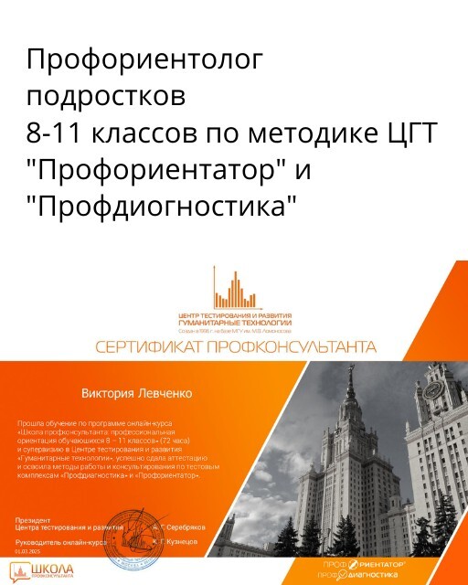 Семейный профориентолог подростков и взрослых (Академия Людмилы Салоид, Школа карьерного менеджмента "Профориентатор подростков" и "Профориентатор взрослых").